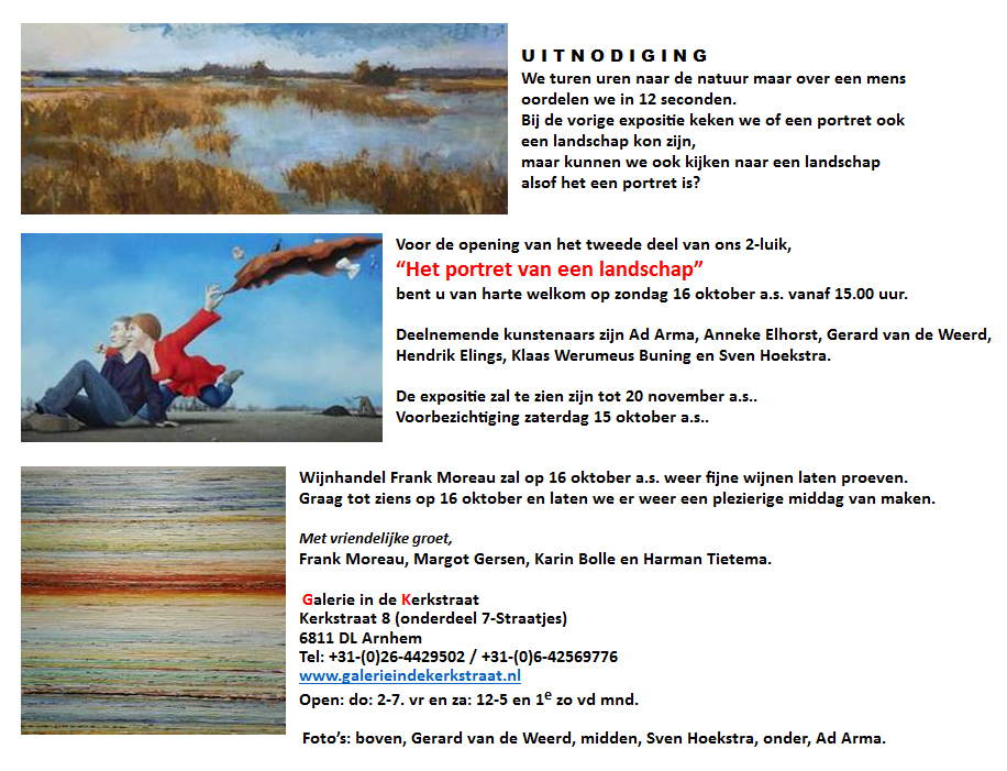 Tentoonstelling Galerie In De Kerkstraat Arnhem van 21 september t/m 25 oktober zie www.galerieindekerkstraat.nl #